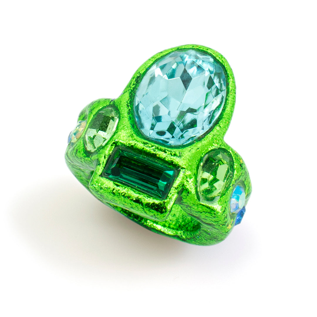 Add boundless bling to your daily looks with this fabulous Paired Stone ring that was made to be yours with vintage Swarovski rhinestones and Lime metal leaf.