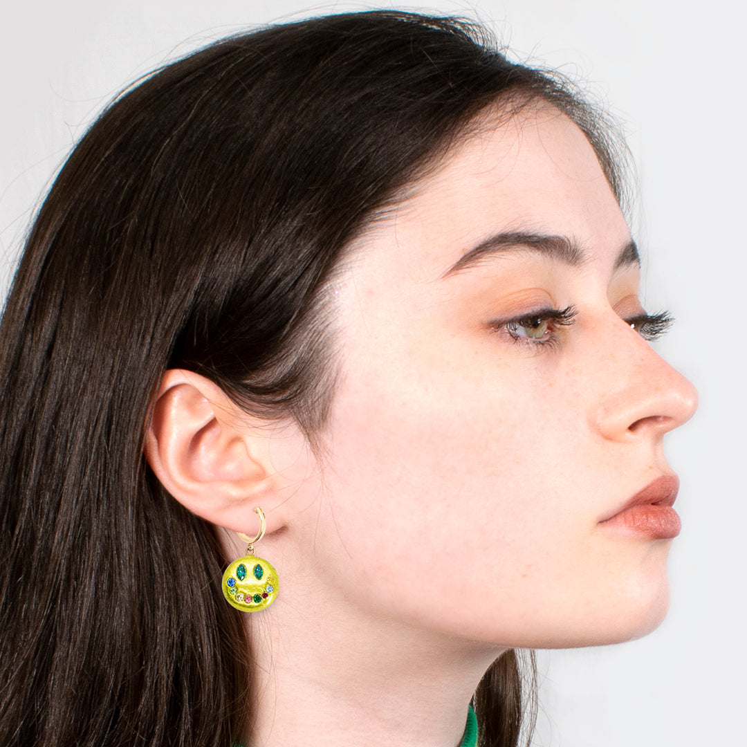 Greet the world with this pair of cheerful Smiley Hoop Drops, made just for you, with Claire’s selection of rare & vintage rhinestones set into your choice of metal leaf color, and hung from gold-filled or sterling silver hoops.